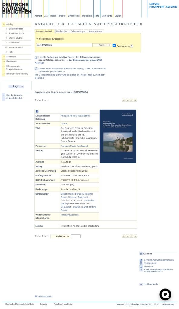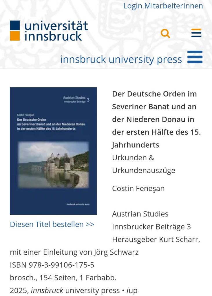 Un exemplu al acestei bizarerii din peisajul cultural românesc merită relatat: în toamna anului trecut, a avut loc în Austria publicarea unei lucrări de referință a istoricului român Costin Feneșan: „Der Deutsche Orden im Severiner Banat und an der Niederen Donau in der ersten Hälfte des 15. Jahrhunderts” („Ordinul Teuton în Banatul de Severin și la Dunărea de Jos în prima jumătate a secolului al XV-lea”). Cartea a apărut la o editură prestigioasă din Innsbruck (IUP – Innsbruck University Press), ca al treilea volum din seria Austrian Studies – rumänische Beiträge (Studii Austriece – contribuții românești). Lucrarea este rezultatul unei colaborări academice internaționale și al unei cercetări riguroase asupra prezenței Ordinului Teuton în spațiul românesc, însumând 152 de pagini de documente și extrase de arhivă inedite.